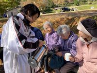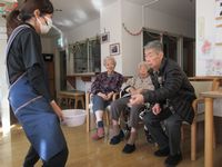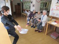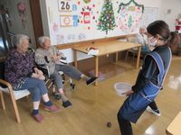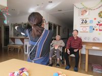 職員が持っている洗面器に向けてお手玉が何個入るか競いました(^^;) 「しら、しん、けん」「せーの」と掛け声を出しながら一生懸命投げられていました。職員の動きにご利用者も職員も大爆笑( *´艸`) 楽しい時間を過ごしました。