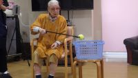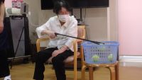 室内レクリエーションにて、利用者様に作っていただいた用具を使い、挟んでカゴにIN。