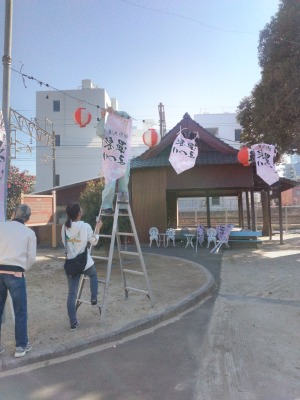 提灯やのぼりを設置し、徐々にお祭りムードに!