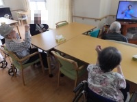テレビにてYoutubeを見ながら、スタッフも一緒に声かけを行いながら身体を動かしています♪
