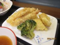 春菊と海老のかき揚げを、温かいお蕎麦にのせます。