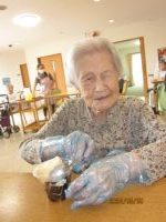 こんがりと焼いて、入居者様に、ソース・マヨネーズを