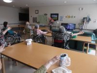 体操レクを行いました。スタッフが事前に撮影した椅子に座っていても出来る体操です♪