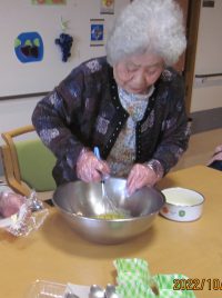 10月のおやつレクのメニューは・・・1F 「ハロウィンカボチャ蒸しケーキ」 2F「キティちゃんケーキ作り」
