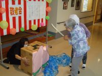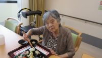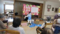 桃太郎では入居者様に川から流れてきた桃を割って頂くと元気な桃太郎が登場!!