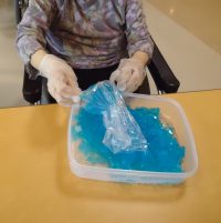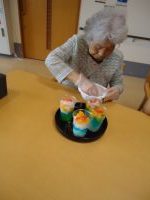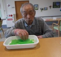 今月のおやつレクは、七夕のおやつに合わせ「星空ゼリー」を皆様と作りました。