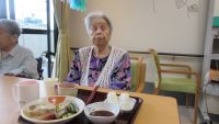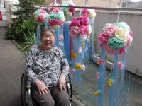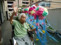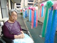 七夕用に大きな可愛らしい吹き流しを各フロアで作って飾っていましたが、この日は晴天にも恵まれたので、1Fのベランダに沢山の吹き流しを飾り、記念撮影会を行いました♪