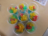 カルピス味の白い寒天、ブルー、グリーンの寒天を重ね、一番上に真っ赤なチェリー、ミカンをアクセントにトッピングして頂き、色鮮やかな、とても清涼感のある七夕らしいおやつが出来上がりました(#^^#)