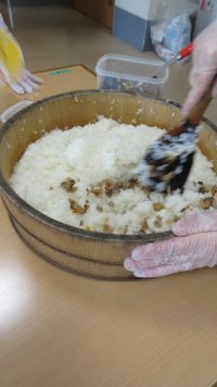 当日は薄焼き卵を作ったり、大葉を切ったり・・・具材を混ぜませ・・・とっても豪華で美味しいちらし寿司が完成しお吸い物を添え召し上がって頂きました(^^♪