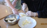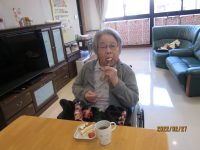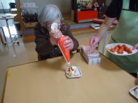 2月のおやつレクは「誕生日ケーキ」を皆様と作りました。イチゴ、バナナを沢山トッピングし、各々のケーキにホイップクリームを思う存分絞って頂きました(^^♪