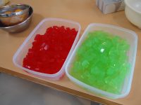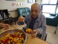 9月のおやつレクは、「フルーツあんみつ」でした。色とりどりな寒天を一口大に切って頂いたり、フルーツを切って頂き