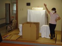 スタッフが箱の中に入ると、箱を釘差し!!入居者様から「中の人は大丈夫!?」と心配する声が聞こえましたが、スタッフが