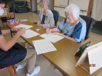 はぴね別府流川では、くもん学習療法を導入し、認知症予防に努めています。週に3回から4回、約20分間簡単な音読、計算、コマ並べ、実践士とのコミュニケーションを行う事で、脳の活性化に繋がります。本日も楽しく学習に参加されているご様子です(^^♪