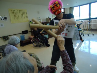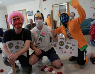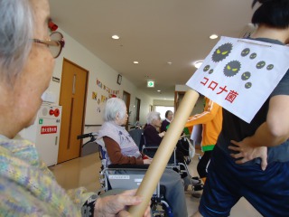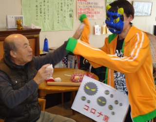 コロナ菌の鬼を退治。皆さん全力で棒で叩いたり