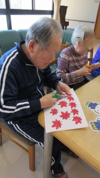 入居者様が、クレヨンで一枚一枚丁寧に色を塗られ、一枚一枚ハサミで切り、白い壁に見事な紅葉が出来上がりました。