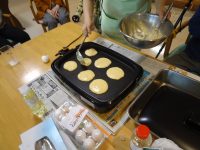 ホットプレートで生地を焼き「まだかな・・焼けたかな・・・」と待ち遠しい様子♪