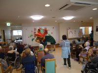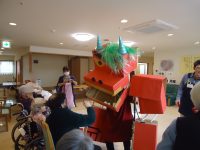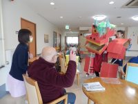 「鬼が来たぞ~!」のかけ声と共にお手玉を「鬼は~外!」「福は~内!」といつもは優しい入居者様達も勢いよく鬼に投げつけ邪気を払いました!!