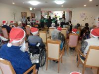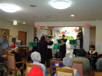 12月22日にクリスマス会を開催致しました。浜脇中学生のフルート部の学生さん達が来館され、演奏を披露してくれました。綺麗なフルートの音色が館内に響き渡り、入居者様も「綺麗な音色ね♪」と喜ばれておりました。又、スタッフによるマジックショーも開催!最後には、サンタクロースからのクリスマスプレゼント贈呈があり、楽しクリスマスとなりました(^^)/