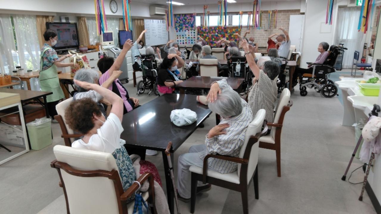 これは体操しておりますね☆ スタッフの元気な声と、利用者さんの笑い声が飛び交う飛び交う♪