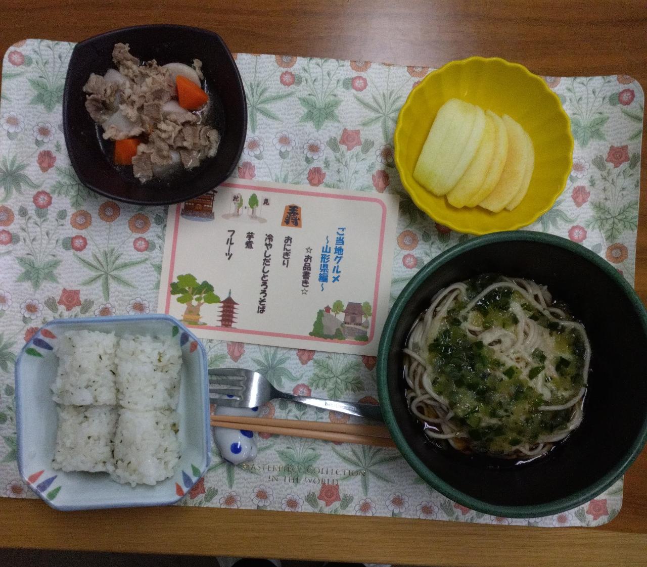 芋煮、冷やしだしとろろそば、おにぎり、フルーツを