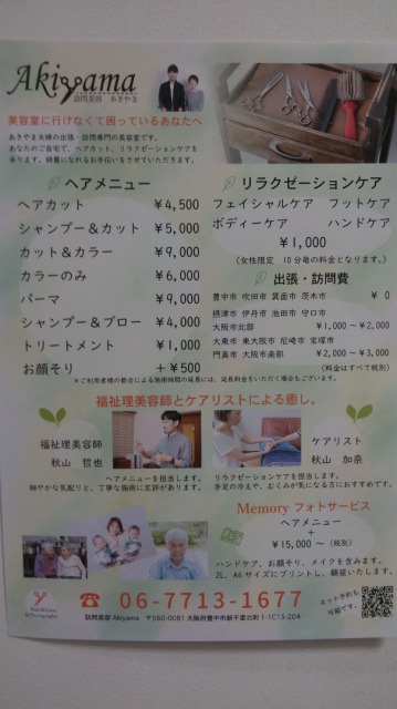 本日は、訪問理美容で「はぴね江坂」に2回/月来てくれている