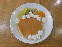 あつあつホットケーキにフルーツを添えておやつを楽しむフロア