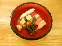 いなり寿司・ちらし寿司・唐揚げにデザートは三色ケーキ