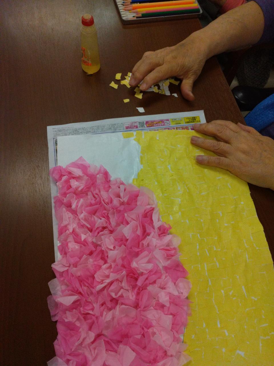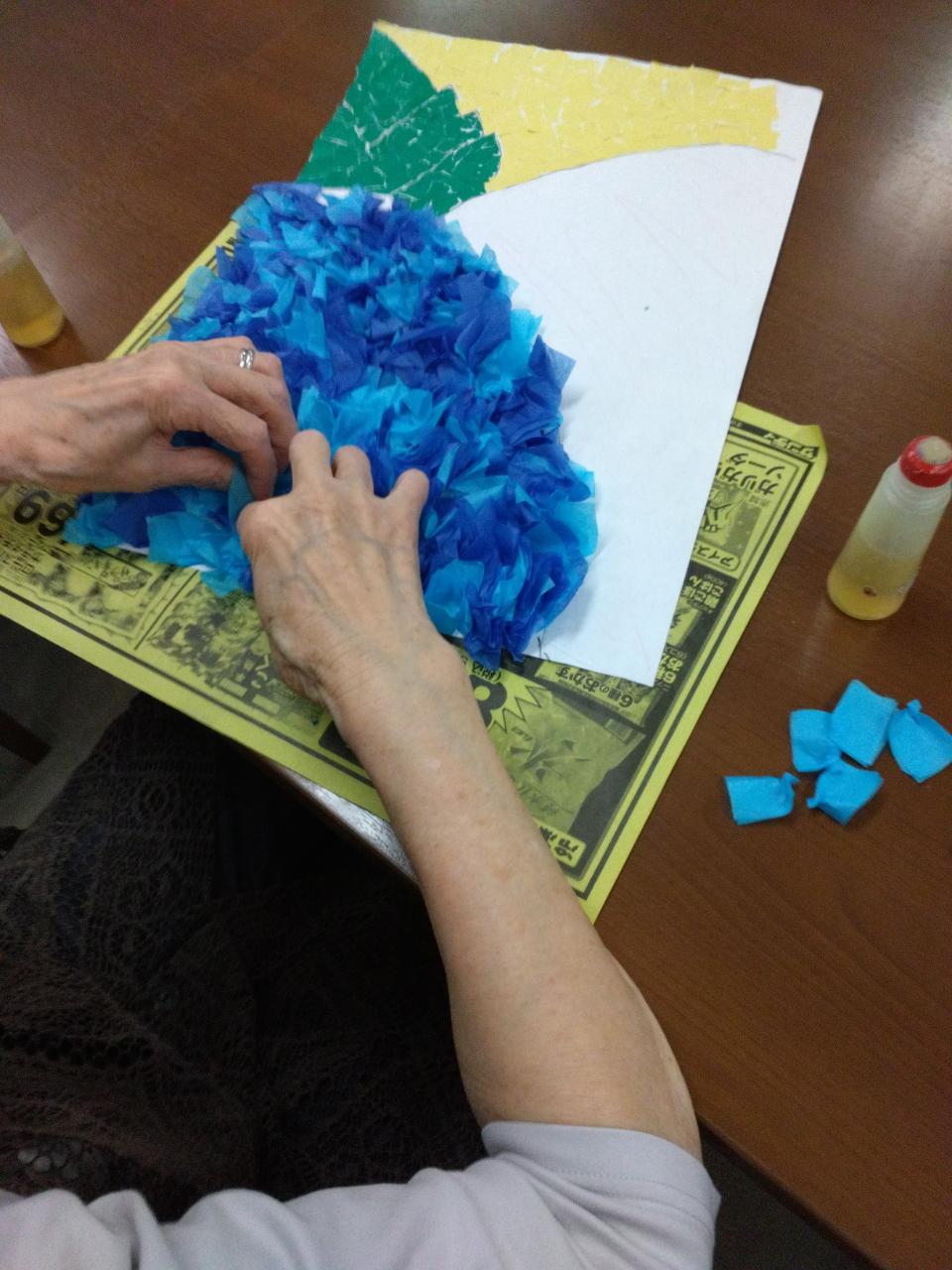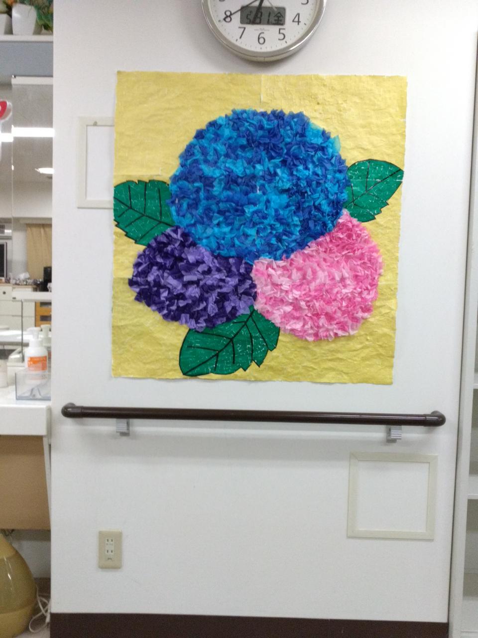 今、デイサービスでは創作時間に紫陽花の貼り絵を作っています。