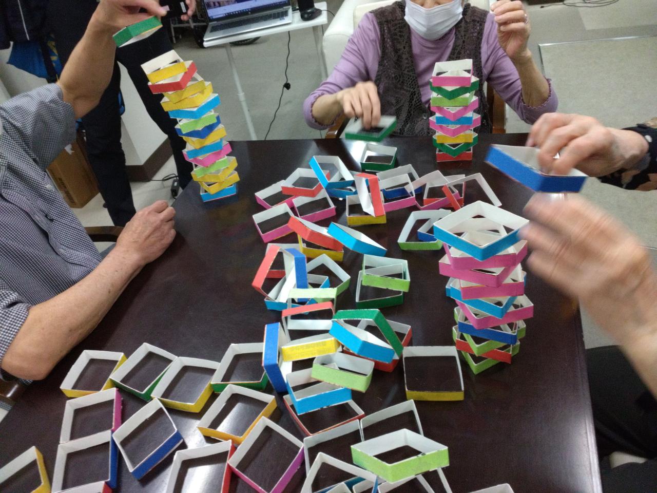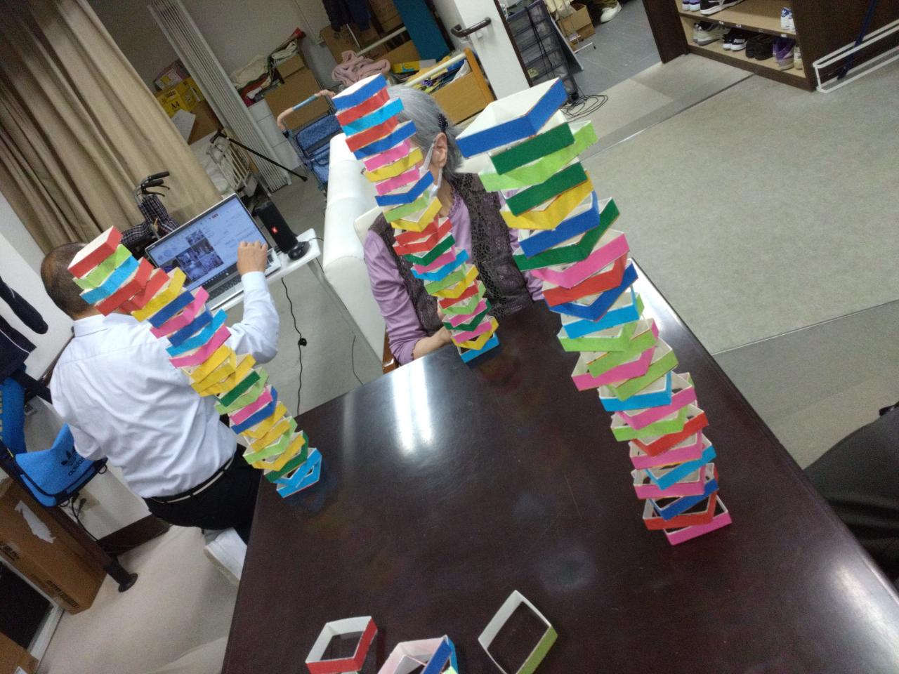 今月は、牛乳パックを輪切りにして、それを25個早く積み上げる競技です。