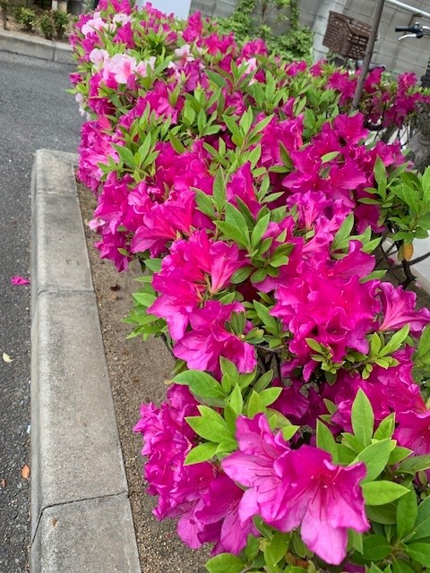 今日は曇り空で午後から雨模様の予報です、はぴね江坂の植え込みにはサツキ🌸が満開になって
