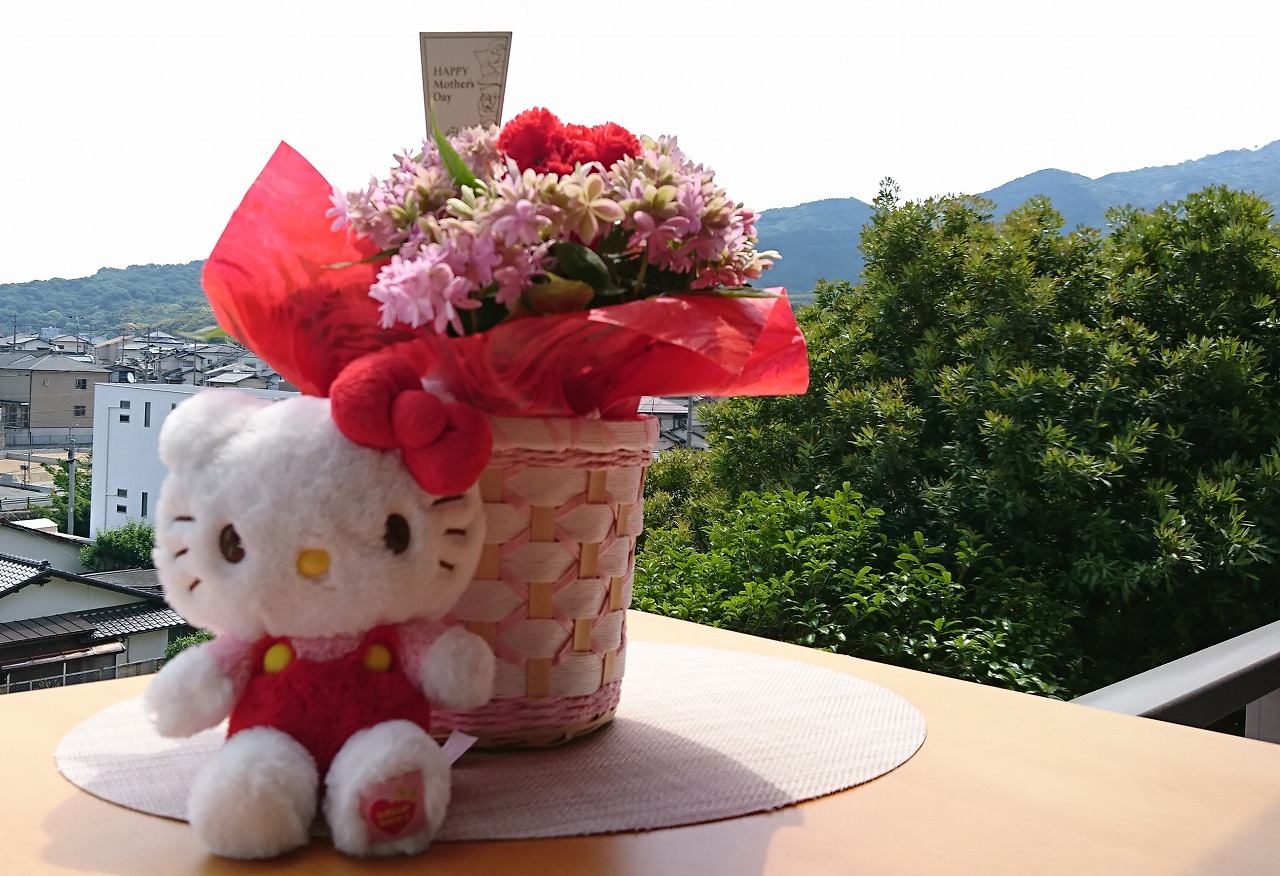 本日の写真は、綺麗なお花、お花と可愛いハローキティちゃん