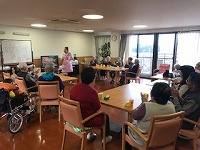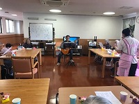 皆様で談笑されながら、カラオケ大会や入居者様によるギターとハンドベル演奏会、スタッフによるフラダンスと楽しい演目がめじろおし☆