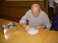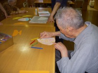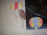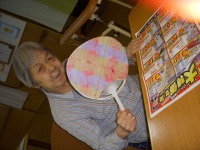 早速ですが、一昨日うちわ作品の様子を紹介しましたが、本日無事に完成いたしまして、展示する事が出来ました。皆様、思い思い作られたうちわが背景に花火といいバランスで飾られてとても喜ばれておりますよ!今度は実際にこのうちわをもって本物の花火を見にいけたら・・・・・・と、次ぎの目標が出来ました!『本物の花火を見に行きましょう!』をなんとしても実行しましょう!!!