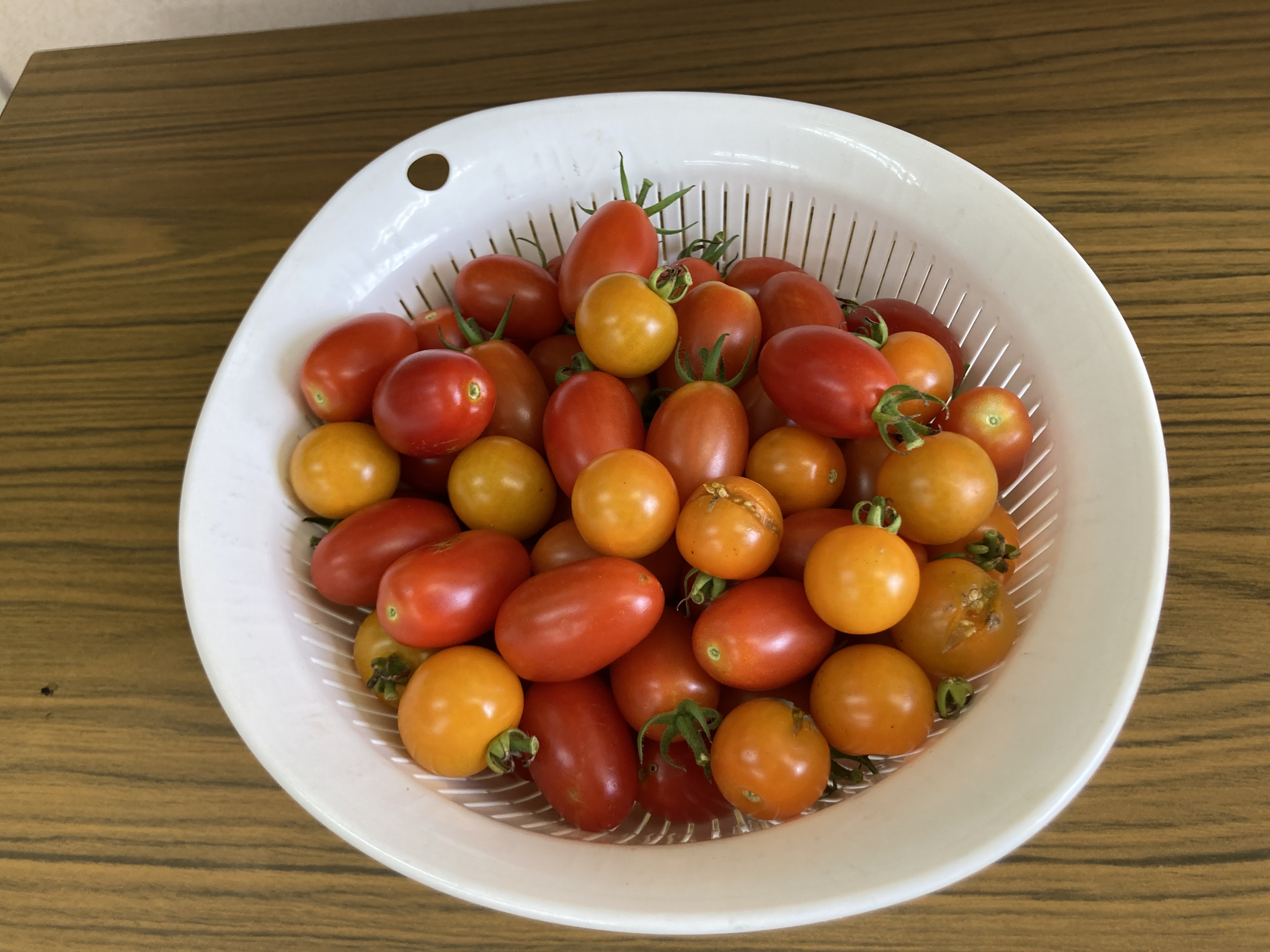 4月にミニトマトの種を蒔き、苗から育てたミニトマトが畑で完熟し、先日からカラスが頻繁に収穫に現れ、食べ残した🍅が散乱しており、今日はカラスが現れるまでに、収穫しました。猛暑の影響で皮は少し固めでしたが、今日のおやつに召し上がって頂きました(^_-)-☆