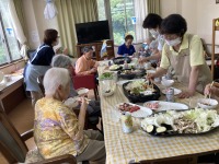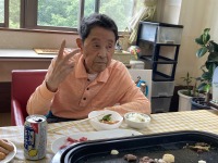 梅雨入りし外は梅雨空の中、今日はパット焼肉で梅雨空を吹き飛ばそうと、焼肉パーティを開催しました。前日から、豆ごはんの皮むきのお手伝い。当日の朝から食材の準備と、女性の方にお手伝いをお願いしました。昼食には、ジビエの肉に舌鼓みを打たれ、美味しかったよと皆さん喜ばれていました(^_-)-☆