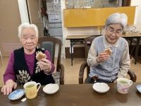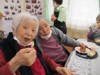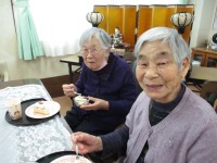 スタッフが持ってきたひな人形を飾り、ケーキとひなあられを食べながら昔の話に花を咲かせていました。