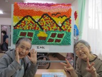 皆様、花紙を渡すと黙々と丸めて下さいました。その後は丸めた花紙をくっつける作業でしたが、夕日のグラデーションや紅葉の山は赤と黄色だけじゃ面白くなさそう…等々、考えることは多かったですが、何とか完成しました。