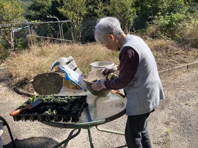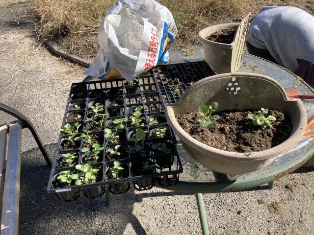 種まきしたパンジーの苗が成長し、移植の時期を迎えました。朝から秋晴れの下、利用者様にポット苗から、植木鉢に移植して頂きました。植木鉢の除草作業など手際よくお手伝いをしていただき、開花するまで成長していく姿を楽しみにして頂きたいと思います(^_-)-☆