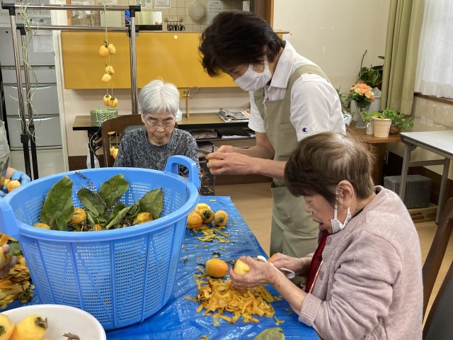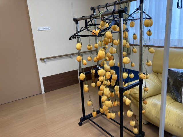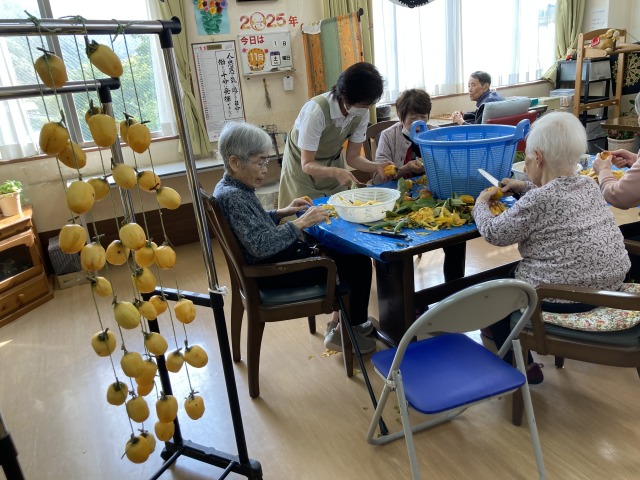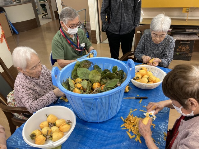 今日は、朝から恒例の干し柿作りのお手伝いをしていただきました。柿の皮を剝きながら、北海道生まれの方は、北海道には柿が無いので柿の皮を剥いたことがないとか・・何日で食べられるのかね、など色々と干し柿談義で約80個位の皮剥きに黙々と取り組まれました。出来上がった干し柿で柚子巻き柿などを作り召し上がっていただこうと思います(^_-)-☆