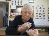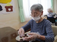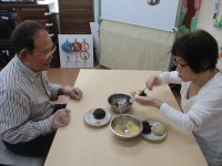 手袋をし、もち米をあんこで包んでもらいました。綺麗におはぎを作られる方もいれば、途中待ちきれずに作りながら食べる方もおられました。