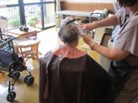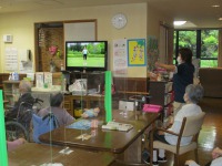 スタッフがご入居者様の前で 大きな身振りでラジオ体操をしている所へ