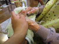 マッサージをした後、ラップで巻いて蒸しタオルで