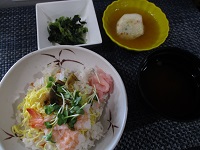 “ちらし寿司・ふんわり天・小松菜のわさび和え・赤だし”