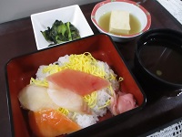 海鮮チラシ・煮奴・小松菜のおぼろ和え・赤だし