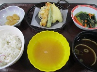 天婦羅(天つゆ)・青菜の煮浸し・白花豆