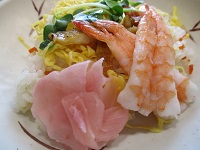 ちらし寿司、厚揚げの煮物、オクラの生姜和え