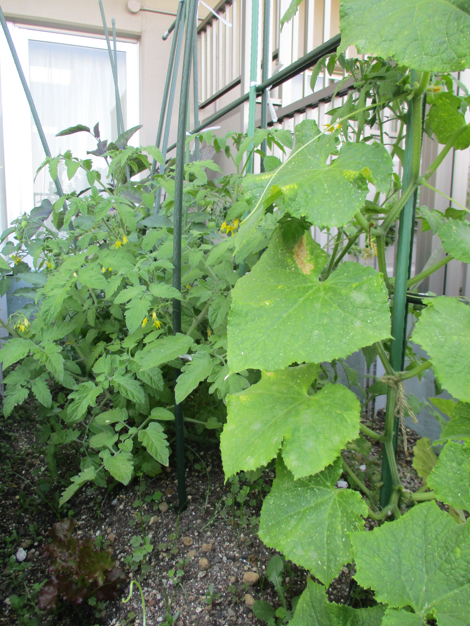 なす、トマト、きゅうりを植え成長を見守っています。