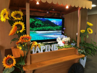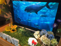 夏の花に囲まれたキティさんの後ろにあるモニターの