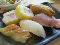 玉子で巻かれた巻きずしと、握りずしで福を呼び込みます。