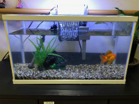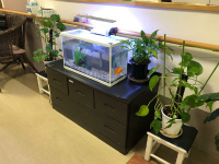 水槽のブルーやグリーン、金魚の赤が引き立ちます。